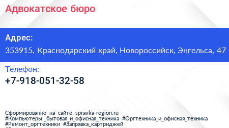 Адвокатское бюро по адресу 353915, Краснодарский край, Новороссийск, Энгельса, 47 в дальнейшем Организация, размещена в следующих категориях: