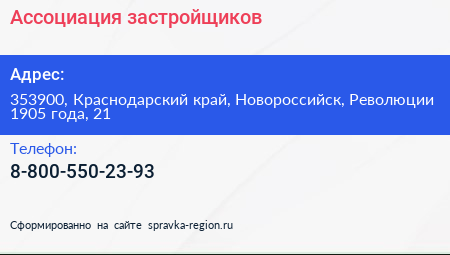 Ассоциация застройщиков по адресу 353900, Краснодарский край, Новороссийск, Революции 1905 года, 21 в дальнейшем Организация, размещена в следующих категориях: