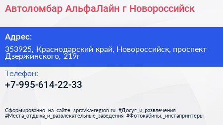 Автоломбар АльфаЛайн, г. Новороссийск по адресу 353925, Краснодарский край, Новороссийск, проспект Дзержинского, 219г в дальнейшем Организация, размещена в следующих категориях: