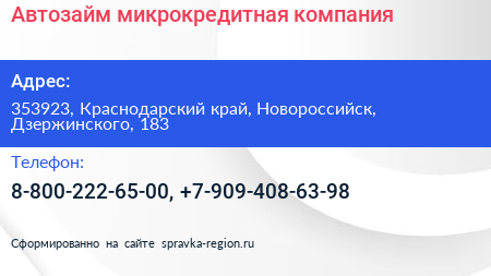 Автозайм, микрокредитная компания по адресу 353923, Краснодарский край, Новороссийск, Дзержинского, 183 в дальнейшем Организация, размещена в следующих категориях: