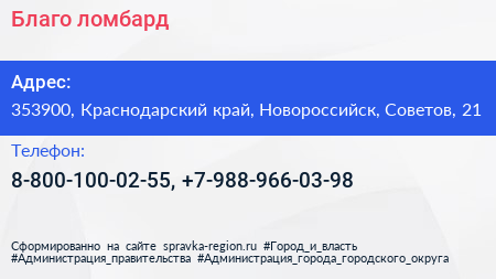 Благо, ломбард по адресу 353900, Краснодарский край, Новороссийск, Советов, 21 в дальнейшем Организация, размещена в следующих категориях:
