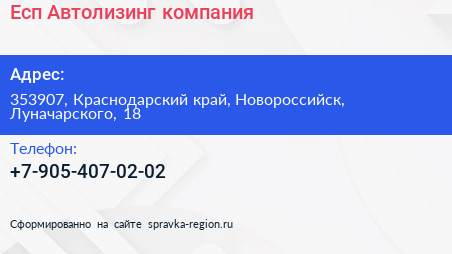 Есп Автолизинг, компания по адресу 353907, Краснодарский край, Новороссийск, Луначарского, 18 в дальнейшем Организация, размещена в следующих категориях: