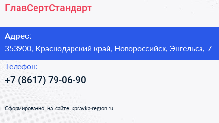 ГлавСертСтандарт по адресу 353900, Краснодарский край, Новороссийск, Энгельса, 7 в дальнейшем Организация, размещена в следующих категориях: