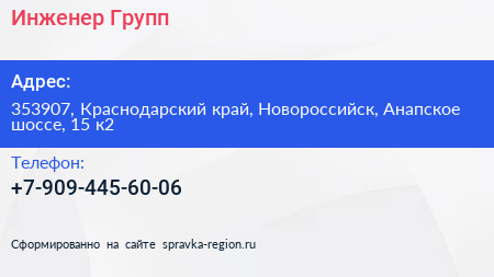 Инженер Групп по адресу 353907, Краснодарский край, Новороссийск, Анапское шоссе, 15 к2 в дальнейшем Организация, размещена в следующих категориях: