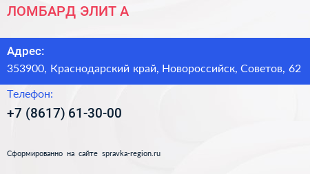 ЛОМБАРД ЭЛИТ-А по адресу 353900, Краснодарский край, Новороссийск, Советов, 62 в дальнейшем Организация, размещена в следующих категориях: