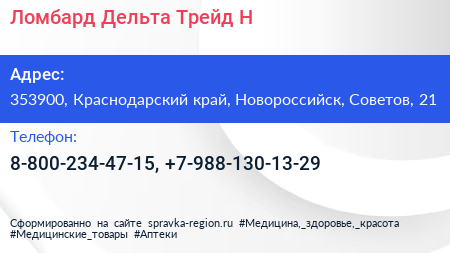 Ломбард Дельта-Трейд-Н по адресу 353900, Краснодарский край, Новороссийск, Советов, 21 в дальнейшем Организация, размещена в следующих категориях: