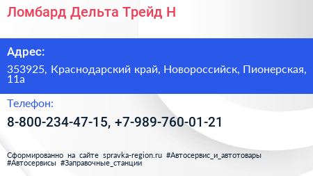 Ломбард Дельта-Трейд-Н по адресу 353925, Краснодарский край, Новороссийск, Пионерская, 11а в дальнейшем Организация, размещена в следующих категориях: