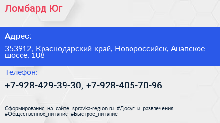 Ломбард-Юг по адресу 353912, Краснодарский край, Новороссийск, Анапское шоссе, 108 в дальнейшем Организация, размещена в следующих категориях: