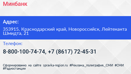 Минбанк по адресу 353915, Краснодарский край, Новороссийск, Лейтенанта Шмидта, 21 в дальнейшем Организация, размещена в следующих категориях: