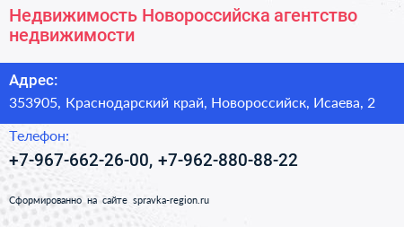 Недвижимость Новороссийска, агентство недвижимости по адресу 353905, Краснодарский край, Новороссийск, Исаева, 2 в дальнейшем Организация, размещена в следующих категориях: