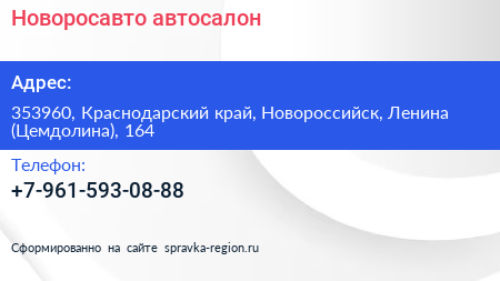 Новоросавто, автосалон по адресу 353960, Краснодарский край, Новороссийск, Ленина (Цемдолина), 164 в дальнейшем Организация, размещена в следующих категориях: