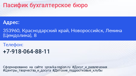 Пасифик, бухгалтерское бюро по адресу 353960, Краснодарский край, Новороссийск, Ленина (Цемдолина), 8 в дальнейшем Организация, размещена в следующих категориях: