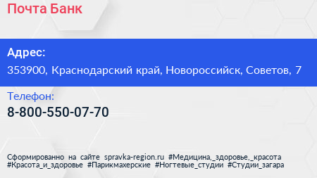 Почта Банк по адресу 353900, Краснодарский край, Новороссийск, Советов, 7 в дальнейшем Организация, размещена в следующих категориях: