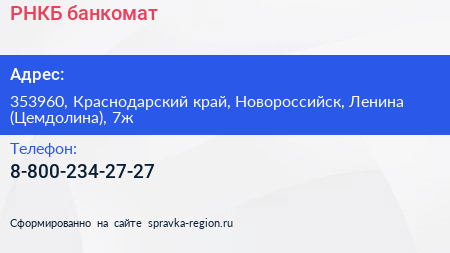 РНКБ, банкомат по адресу 353960, Краснодарский край, Новороссийск, Ленина (Цемдолина), 7ж в дальнейшем Организация, размещена в следующих категориях: