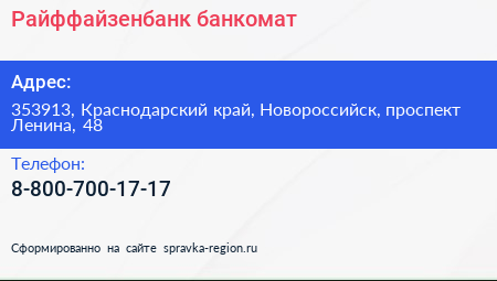 Райффайзенбанк, банкомат по адресу 353913, Краснодарский край, Новороссийск, проспект Ленина, 48 в дальнейшем Организация, размещена в следующих категориях: