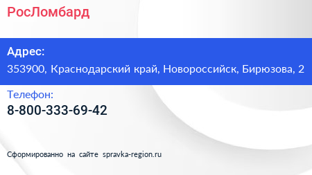 РосЛомбард по адресу 353900, Краснодарский край, Новороссийск, Бирюзова, 2 в дальнейшем Организация, размещена в следующих категориях: