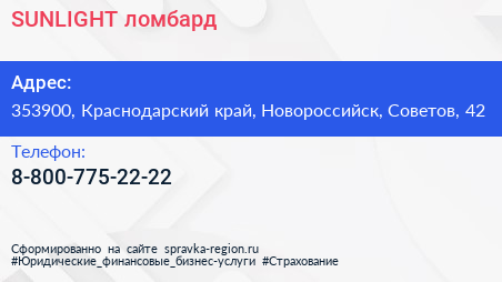 SUNLIGHT, ломбард по адресу 353900, Краснодарский край, Новороссийск, Советов, 42 в дальнейшем Организация, размещена в следующих категориях: