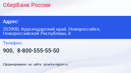 СберБанк России по адресу 353900, Краснодарский край, Новороссийск, Новороссийской Республики, 8 в дальнейшем Организация, размещена в следующих категориях: