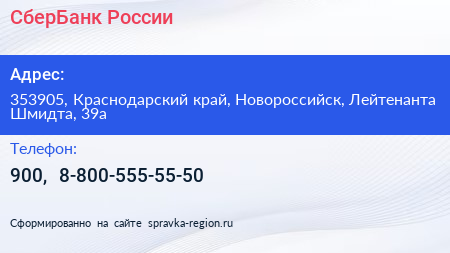 СберБанк России по адресу 353905, Краснодарский край, Новороссийск, Лейтенанта Шмидта, 39а в дальнейшем Организация, размещена в следующих категориях: