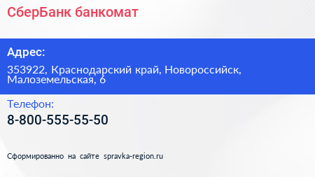 СберБанк, банкомат по адресу 353922, Краснодарский край, Новороссийск, Малоземельская, 6 в дальнейшем Организация, размещена в следующих категориях: