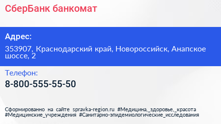 СберБанк, банкомат по адресу 353907, Краснодарский край, Новороссийск, Анапское шоссе, 2 в дальнейшем Организация, размещена в следующих категориях: