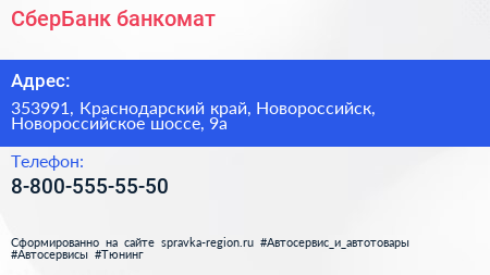 СберБанк, банкомат по адресу 353991, Краснодарский край, Новороссийск, Новороссийское шоссе, 9а в дальнейшем Организация, размещена в следующих категориях: