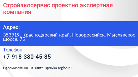 Стройэкосервис, проектно-экспертная компания по адресу 353919, Краснодарский край, Новороссийск, Мысхакское шоссе, 75 в дальнейшем Организация, размещена в следующих категориях: