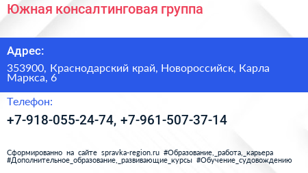 Южная консалтинговая группа по адресу 353900, Краснодарский край, Новороссийск, Карла Маркса, 6 в дальнейшем Организация, размещена в следующих категориях: