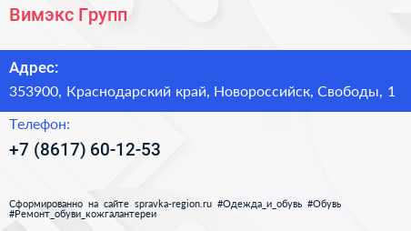 Вимэкс Групп по адресу 353900, Краснодарский край, Новороссийск, Свободы, 1 в дальнейшем Организация, размещена в следующих категориях: