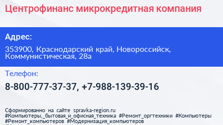 Центрофинанс, микрокредитная компания по адресу 353900, Краснодарский край, Новороссийск, Коммунистическая, 28а в дальнейшем Организация, размещена в следующих категориях: