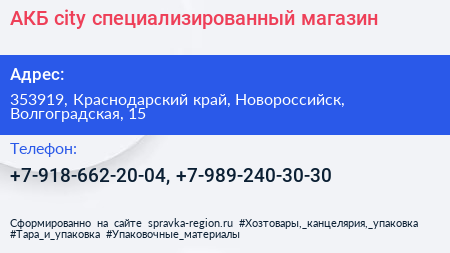 АКБ city, специализированный магазин по адресу 353919, Краснодарский край, Новороссийск, Волгоградская, 15 в дальнейшем Организация, размещена в следующих категориях: