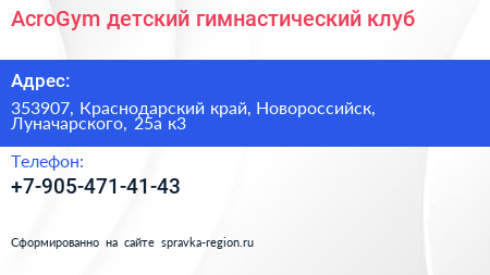 AcroGym, детский гимнастический клуб по адресу 353907, Краснодарский край, Новороссийск, Луначарского, 25а к3 в дальнейшем Организация, размещена в следующих категориях: