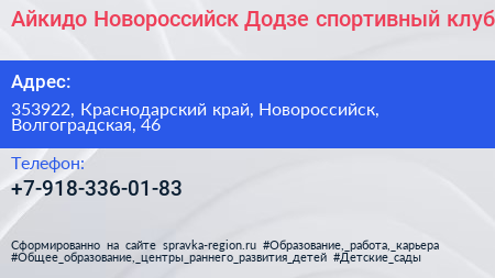 Айкидо Новороссийск Додзе, спортивный клуб по адресу 353922, Краснодарский край, Новороссийск, Волгоградская, 46 в дальнейшем Организация, размещена в следующих категориях: