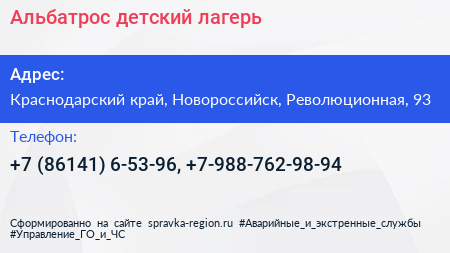 Альбатрос, детский лагерь по адресу Краснодарский край, Новороссийск, Революционная, 93 в дальнейшем Организация, размещена в следующих категориях: