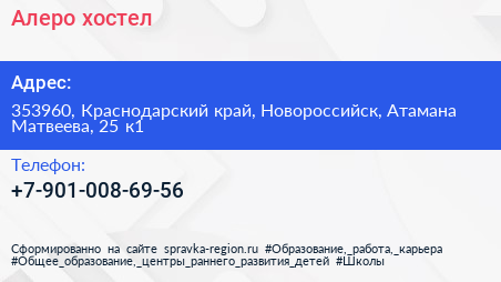Алеро, хостел по адресу 353960, Краснодарский край, Новороссийск, Атамана Матвеева, 25 к1 в дальнейшем Организация, размещена в следующих категориях: