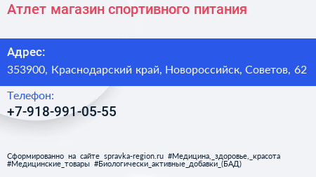 Атлет, магазин спортивного питания по адресу 353900, Краснодарский край, Новороссийск, Советов, 62 в дальнейшем Организация, размещена в следующих категориях: