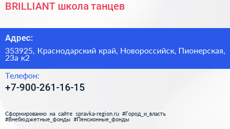 BRILLIANT, школа танцев по адресу 353925, Краснодарский край, Новороссийск, Пионерская, 23а к2 в дальнейшем Организация, размещена в следующих категориях: