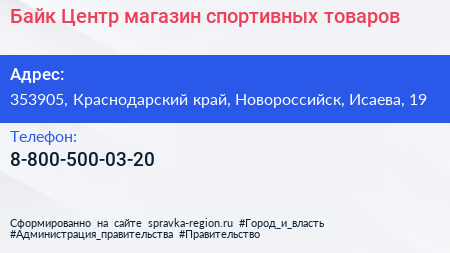 Байк Центр, магазин спортивных товаров по адресу 353905, Краснодарский край, Новороссийск, Исаева, 19 в дальнейшем Организация, размещена в следующих категориях: