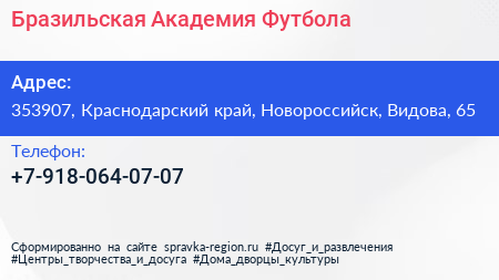 Бразильская Академия Футбола по адресу 353907, Краснодарский край, Новороссийск, Видова, 65 в дальнейшем Организация, размещена в следующих категориях: