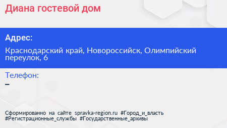 Диана, гостевой дом по адресу Краснодарский край, Новороссийск, Олимпийский переулок, 6 в дальнейшем Организация, размещена в следующих категориях: