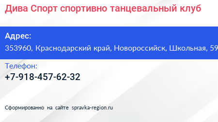 Дива Спорт, спортивно-танцевальный клуб по адресу 353960, Краснодарский край, Новороссийск, Школьная, 59 в дальнейшем Организация, размещена в следующих категориях: