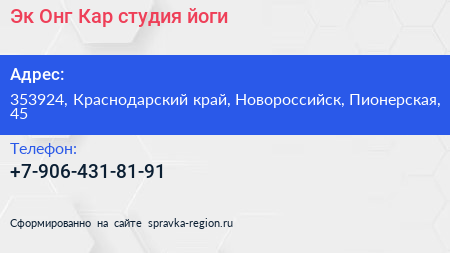 Эк Онг Кар, студия йоги по адресу 353924, Краснодарский край, Новороссийск, Пионерская, 45 в дальнейшем Организация, размещена в следующих категориях: