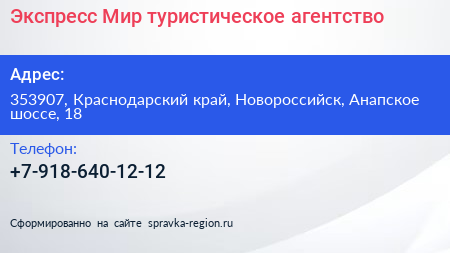 Экспресс Мир, туристическое агентство по адресу 353907, Краснодарский край, Новороссийск, Анапское шоссе, 18 в дальнейшем Организация, размещена в следующих категориях: