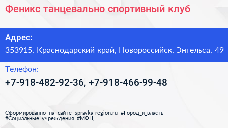 Феникс, танцевально-спортивный клуб по адресу 353915, Краснодарский край, Новороссийск, Энгельса, 49 в дальнейшем Организация, размещена в следующих категориях: