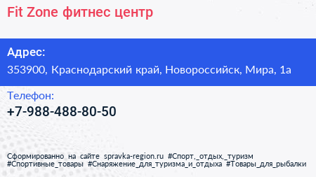 Fit Zone, фитнес-центр по адресу 353900, Краснодарский край, Новороссийск, Мира, 1а в дальнейшем Организация, размещена в следующих категориях: