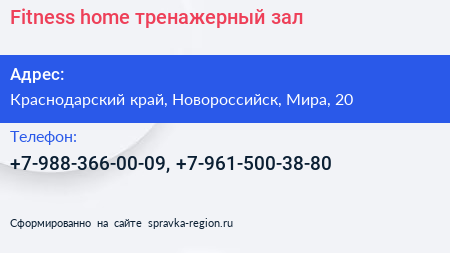 Fitness home, тренажерный зал по адресу Краснодарский край, Новороссийск, Мира, 20 в дальнейшем Организация, размещена в следующих категориях: