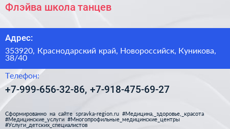 Флэйва, школа танцев по адресу 353920, Краснодарский край, Новороссийск, Куникова, 38/40 в дальнейшем Организация, размещена в следующих категориях: