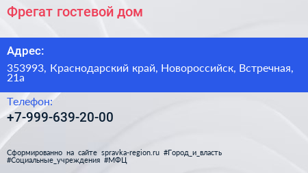 Фрегат, гостевой дом по адресу 353993, Краснодарский край, Новороссийск, Встречная, 21а в дальнейшем Организация, размещена в следующих категориях:
