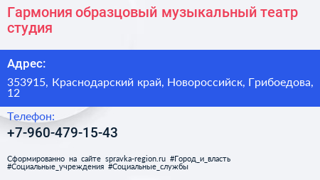 Гармония, образцовый музыкальный театр-студия по адресу 353915, Краснодарский край, Новороссийск, Грибоедова, 12 в дальнейшем Организация, размещена в следующих категориях: