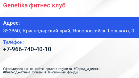 Genetika, фитнес-клуб по адресу 353960, Краснодарский край, Новороссийск, Горького, 3 в дальнейшем Организация, размещена в следующих категориях: